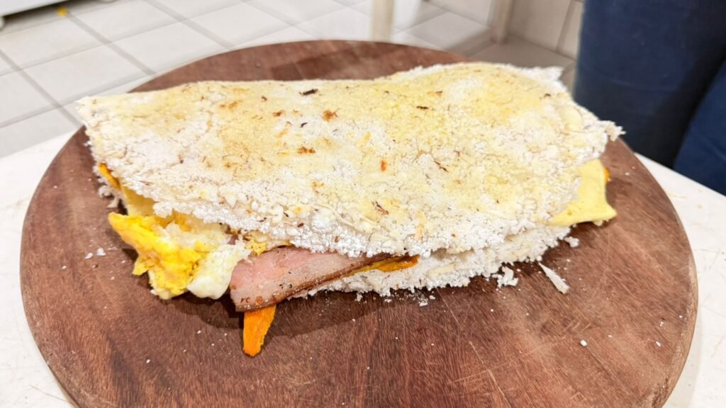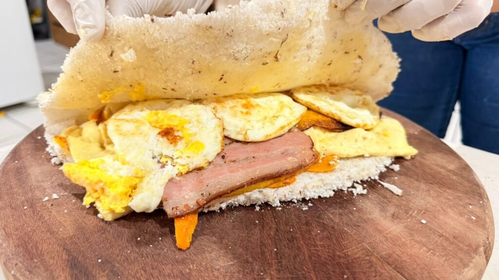 A famosa tapioca gigante é um espetáculo à parte. Com cerca de 30 a 40 centímetros, ela pode ser recheada com até 12 tipos diferentes de sabores, refletindo a diversidade da culinária regional. Aos finais de semana e feriados, a produção chega a impressionar: são cerca de 60 a 70 tapiocas vendidas em um único domingo.