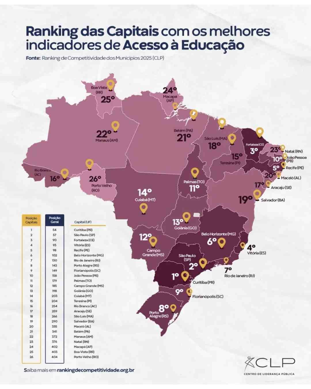 De acordo com o levantamento, as capitais com melhor desempenho em acesso à educação são Curitiba (PR), São Paulo (SP) e Fortaleza (CE). Na outra ponta do ranking aparecem Macapá (AP), Boa Vista (RR) e Porto Velho (RO), que figuram entre as últimas colocações.
