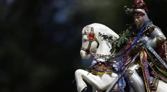 Nas religiões afro-brasileiras, umbanda e candomblé, a figura do santo é frequentemente ligada a Ogum, orixá guerreiro, senhor do ferro e das batalhas. E em algumas regiões, como o caso da Bahia, também pode ser associado a Oxóssi, orixá da caça e da fartura.