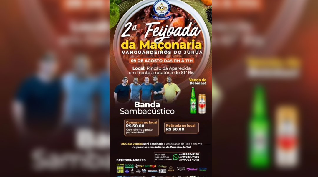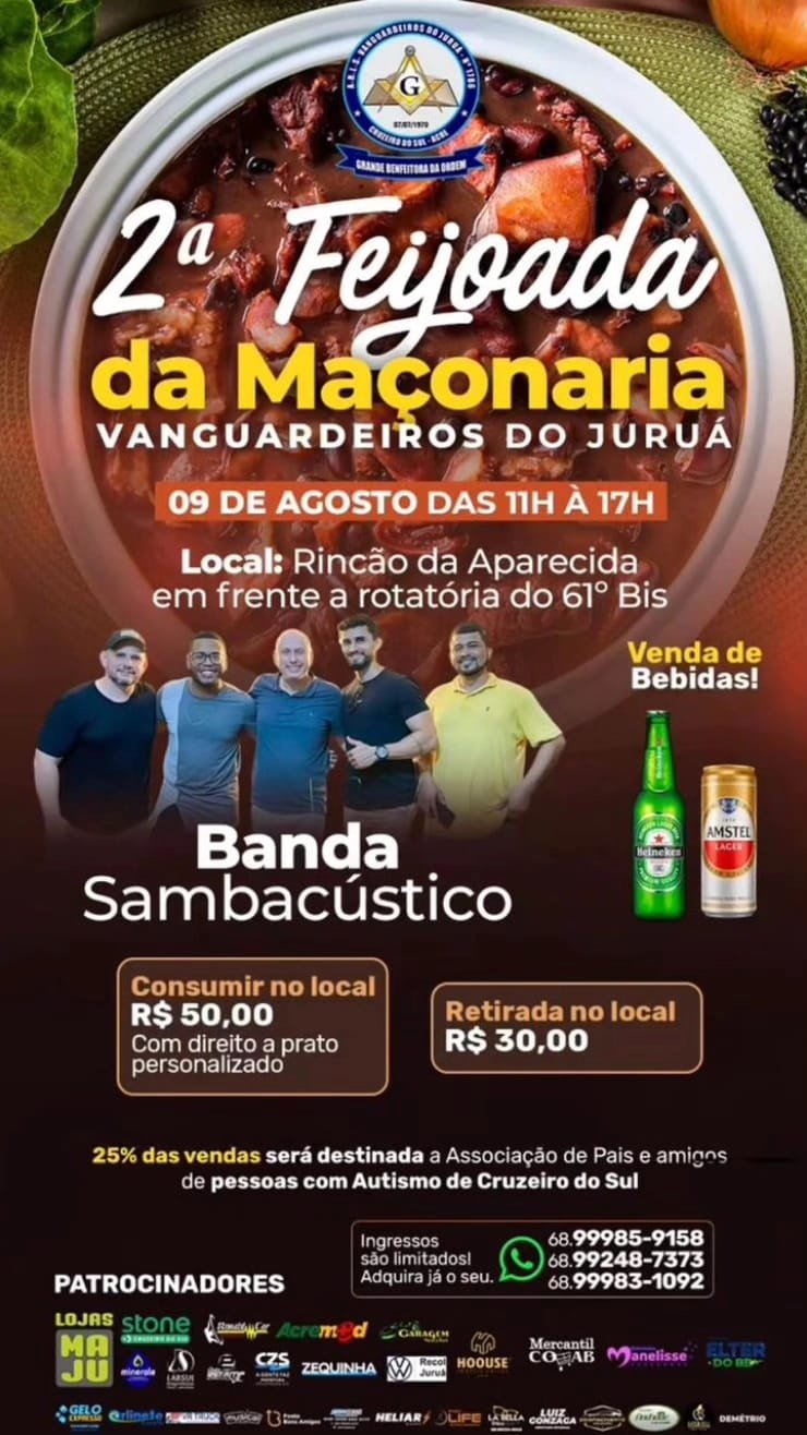 A Loja Maçônica Vanguardeiros do Juruá realiza no dia 9 de agosto de 2025 a 2ª edição da Feijoada da Maçonaria, no Rincão da Aparecida, em frente à rotatória do 61º Batalhão de Infantaria de Selva, em Cruzeiro do Sul. O evento acontece das 11h às 17h, com ingressos a R$ 30,00 para retirada no local e R$ 50,00 para consumo no sistema self-service.