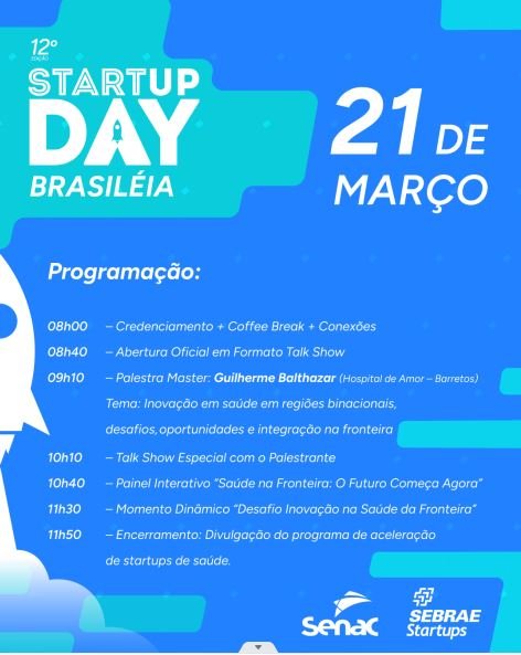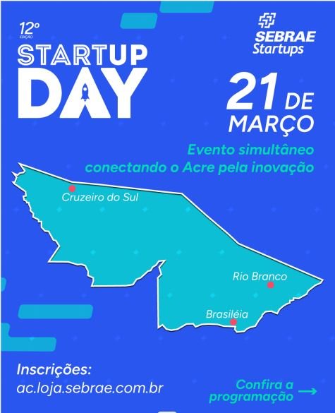 Rio Branco, Brasiléia e Cruzeiro do Sul recebem a 12ª edição do Startup Day no próximo dia 21 de março, sábado, das 8h às 12h. O evento é uma realização do Sebrae e contará com palestras e painéis, buscando estimular e fortalecer a inovação.