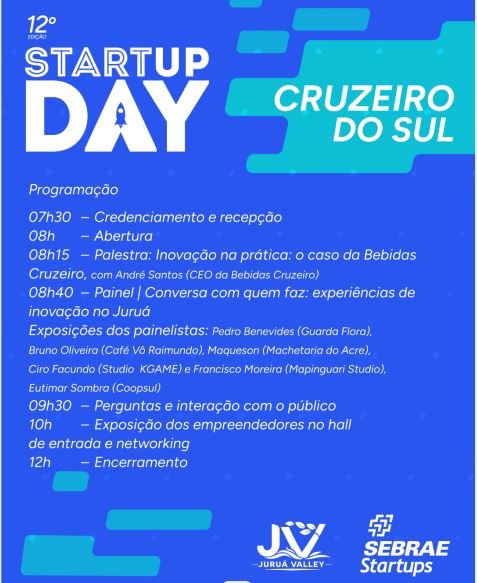 Inscrições: https://ac.loja.sebrae.com.br/startup-day-2026-cruzeiro-do-sul-ac-ev-87735