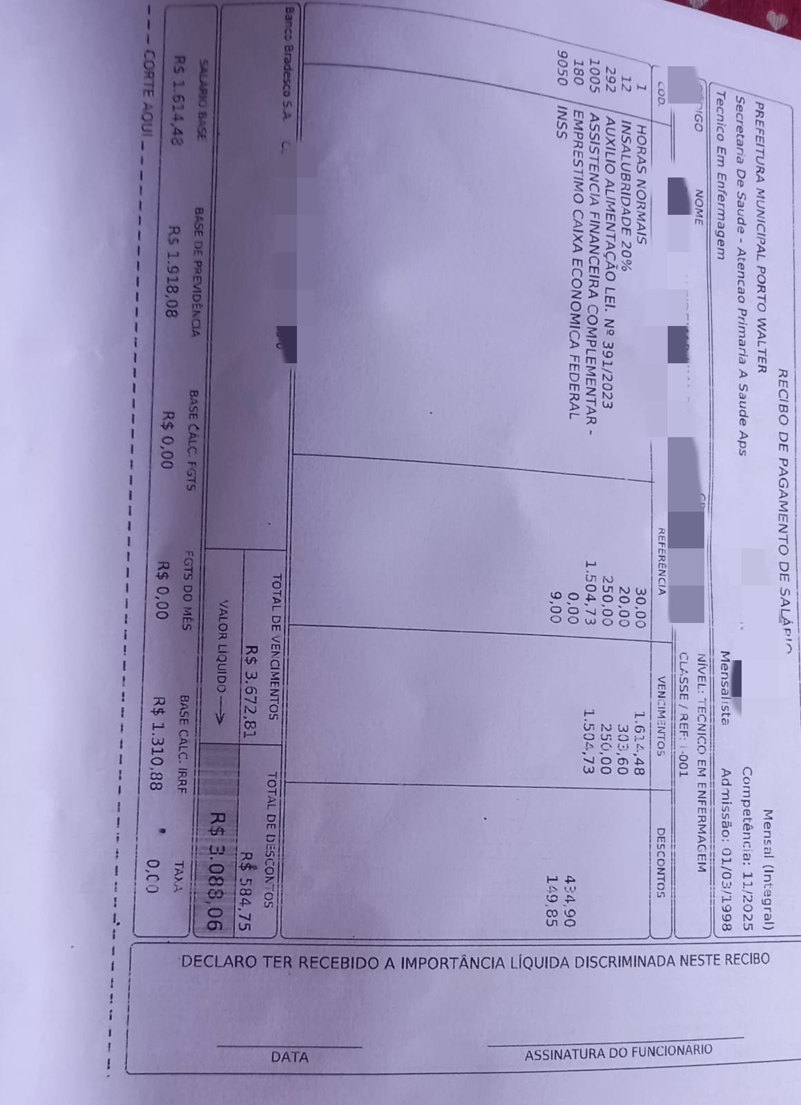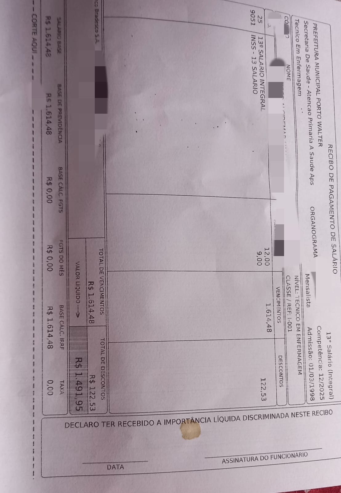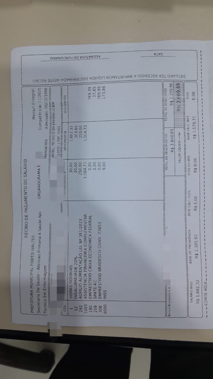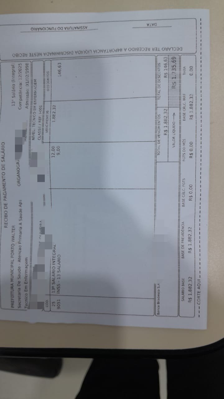Técnicos de enfermagem do município de Porto Walter denunciaram ao Juruá Online possíveis irregularidades nos pagamentos efetuados pela Prefeitura, envolvendo descontos considerados indevidos no décimo terceiro salário, além do atraso no salário referente ao mês de dezembro e na assistência financeira complementar da categoria.