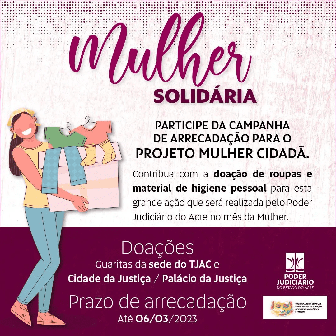 O Tribunal de Justiça do Acre (TJAC) promove a Campanha de Arrecadação Mulher Cidadã, com a finalidade de receber roupas e itens de higiene pessoal para repassar a mulheres em situação de vulnerabilidade social.