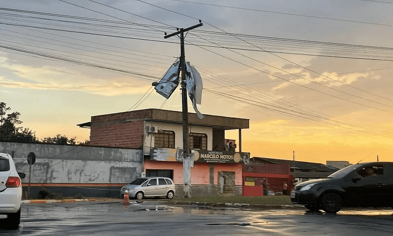 Os efeitos da ventania não se limitaram apenas aos danos visíveis. Folhas de alumínio foram arrastadas, espalhando-se pelas ruas e áreas próximas, e caixas de lixo foram arrastadas. Partes do telhado de uma residência ficaram emaranhadas na fiação elétrica, resultando na interrupção do fornecimento de energia em partes do bairro.