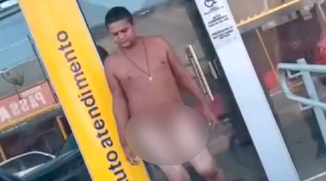 As imagens que circulam nas redes sociais mostram o homem saindo da agência e caminhando em uma avenida completamente sem roupa em plena luz do dia.